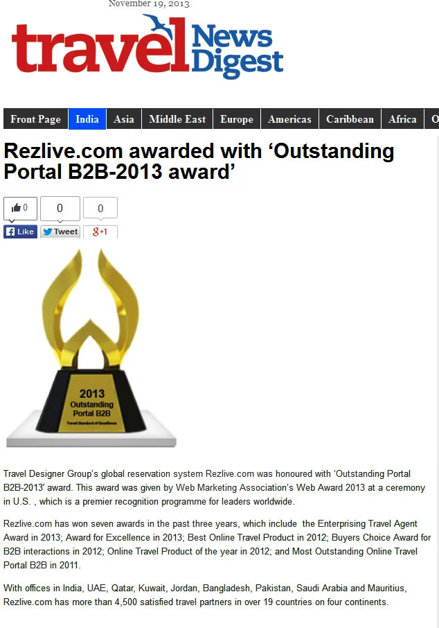 ETB 21 November 2013 RezLive.com Awarded With Outstanding Portal B2B-2013 RezLive.com Awarded With Outstanding Portal B2B-2013