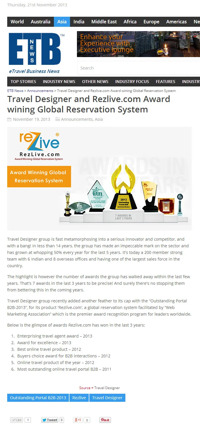 ETB 21 November 2013 RezLive.com Awarded With Outstanding Portal B2B-2013 RezLive.com Awarded With Outstanding Portal B2B-2013